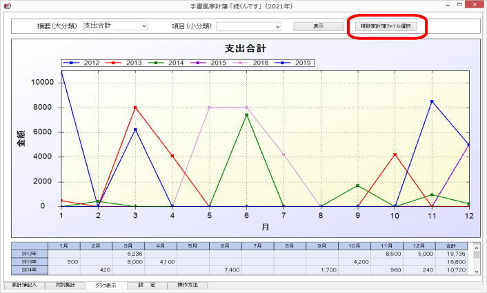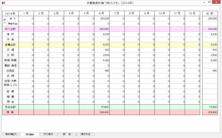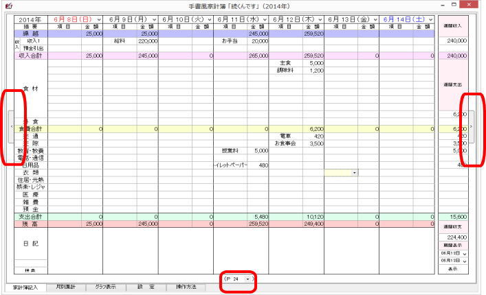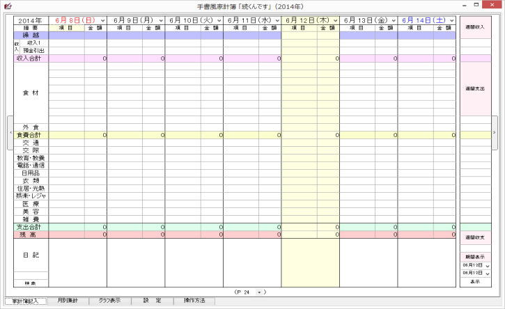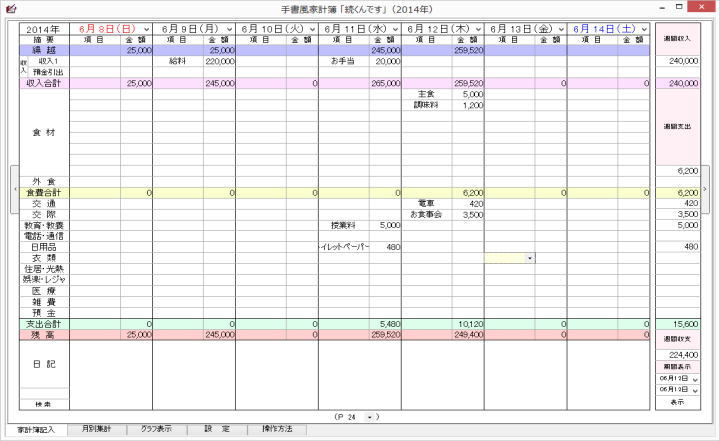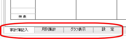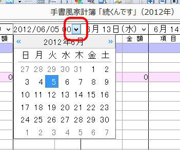 起動させると家計簿入力(表示)画面となり、今日の欄が黄色になっています。今日の分を入力するのであれば、当該黄色の部分に、他の日は日付の位置に入力します。