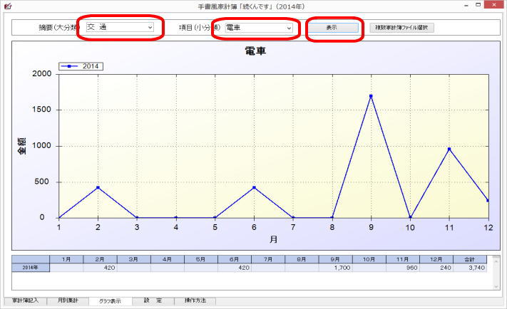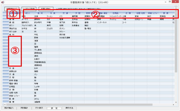 当該文言を設定画面において入力しておいてください。(収入合計、食材の各項目は小分類での集計の対象外です。)